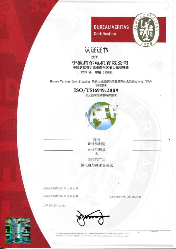 于2017年1月20日順利通過了專家組的審核,成功取得了ISO/TSl6949:2009證書,這意味著拓爾電機(jī)順利成為了汽車行業(yè)的合格零部件供應(yīng)商。此次認(rèn)證,同時(shí)也標(biāo)志著拓爾電機(jī)在設(shè)計(jì)、制造、銷售和服務(wù)等領(lǐng)域的質(zhì)量管理水平已與國(guó)際同步接軌。