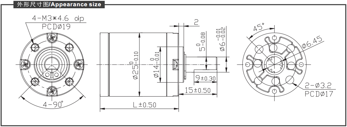 輸出軸直徑為Φ6.0mm,長度可根據(jù)客戶要求定制