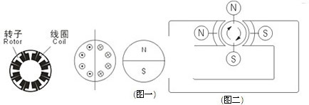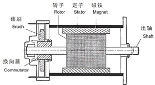 所以電機由固定的永久磁鐵(定子)一個轉動的磁鐵(轉子)和金屬外殼組成,形成電機體。(圖一) 根據異極相吸,(圖二) 同極相斥的原理,扭矩作用到轉子上使其轉動。當轉子磁極的軸向與定子磁極的軸向垂直正交時,扭矩最大,一旦轉子開始轉動,固定碳刷輪流與換向器保持接觸或中斷接觸。轉子線圈按轉子轉動的方式通電和斷電,轉子新產生的磁極的軸向,總是和定子磁極的軸向垂直正交,因為這是由換向器決定的。無論轉子在什么位置,都按固定方式運轉。通過增加換向器的數目來減少合成扭矩的脈動,可使轉子更加平滑地轉動。反接電機的電源,轉子線圈中電流產生的磁極N極和S極都將反轉,作用于轉子上的扭矩也反向,從而電機改變轉動方向,根據其固有特性,DC電機是一種可反向轉動的電機。