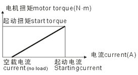 這是電機的第二個重要特性,電流和電機扭矩呈線性關系,用來計算空載電流和轉子靜止時的電流(起動電流)。關系圖中并未隨著電機供電電壓而變化。曲線終點的延長線和扭矩,起始電流相一致,曲線的斜率被稱作電機的扭矩常數。